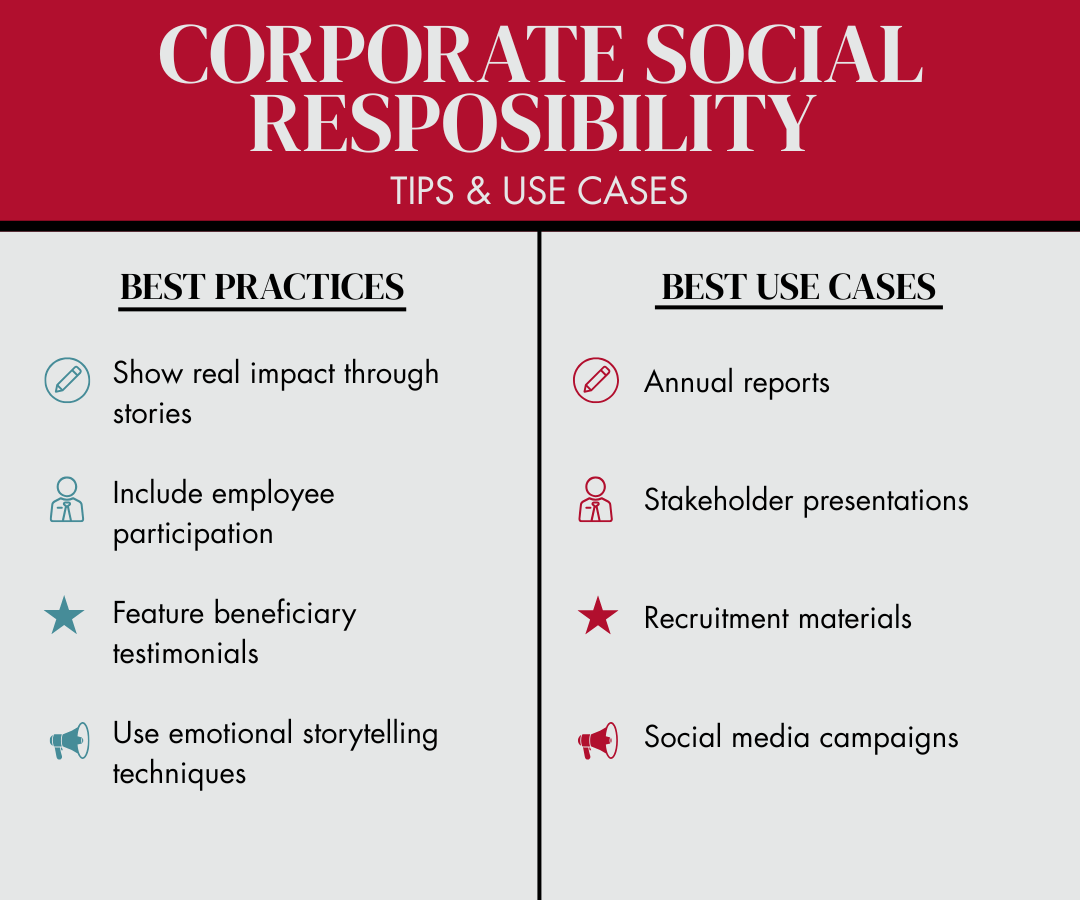Videos about Corporate Social Responsibility (CSR) are an effective way to showcase the positive impact your company has on society. CSR is about businesses stepping up as they grow, giving back, and making a difference for their communities, employees, and everyone they’re connected with.